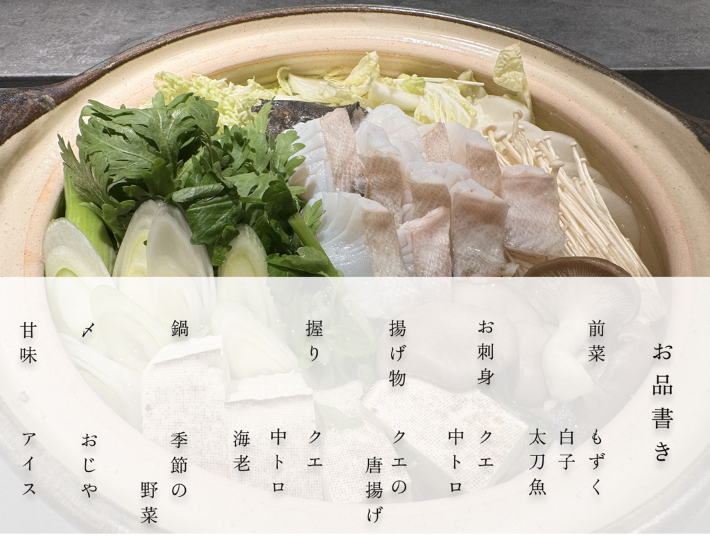 *前菜、お刺身、握りはその日の仕入れ状況により内容が変わります
